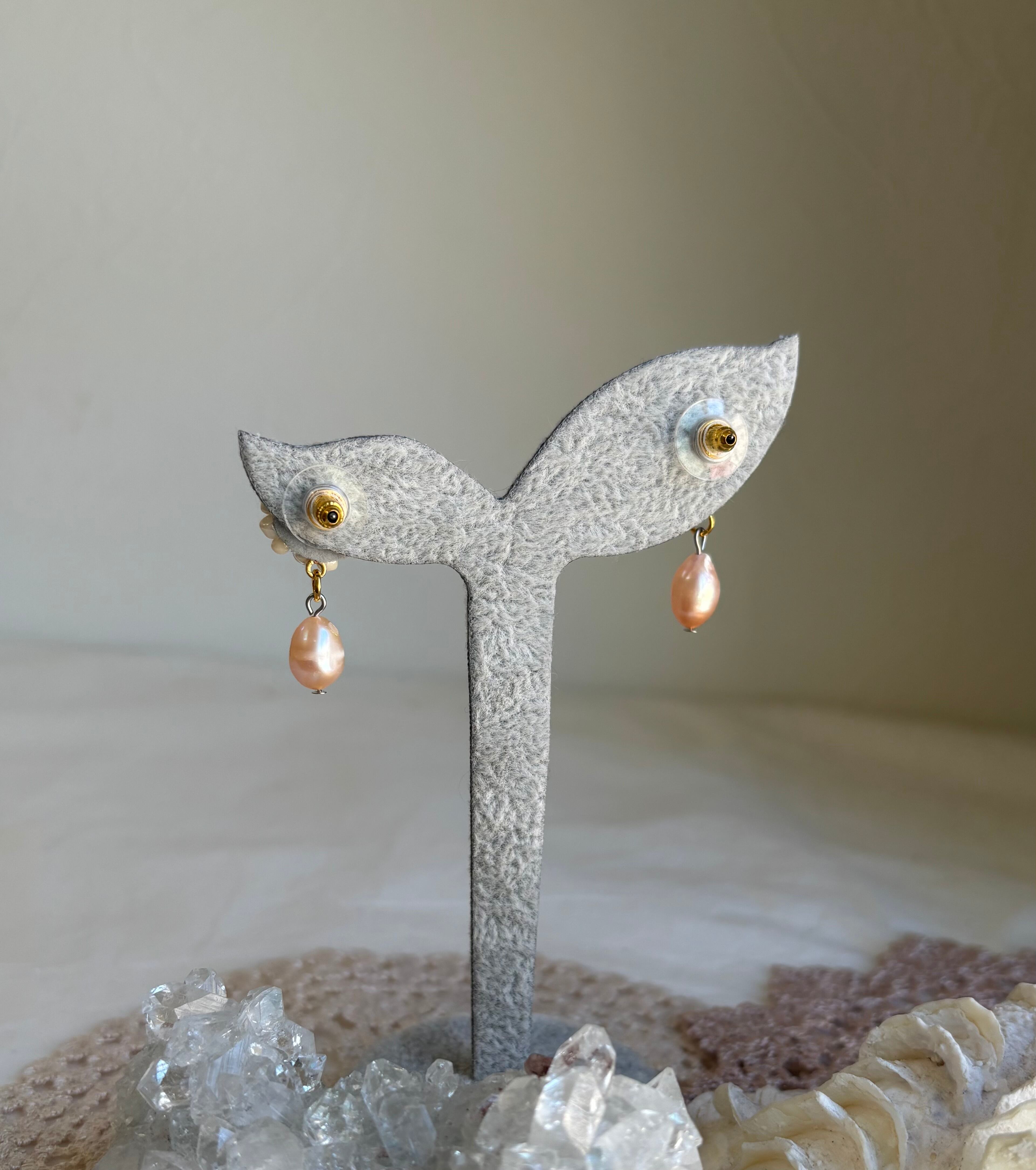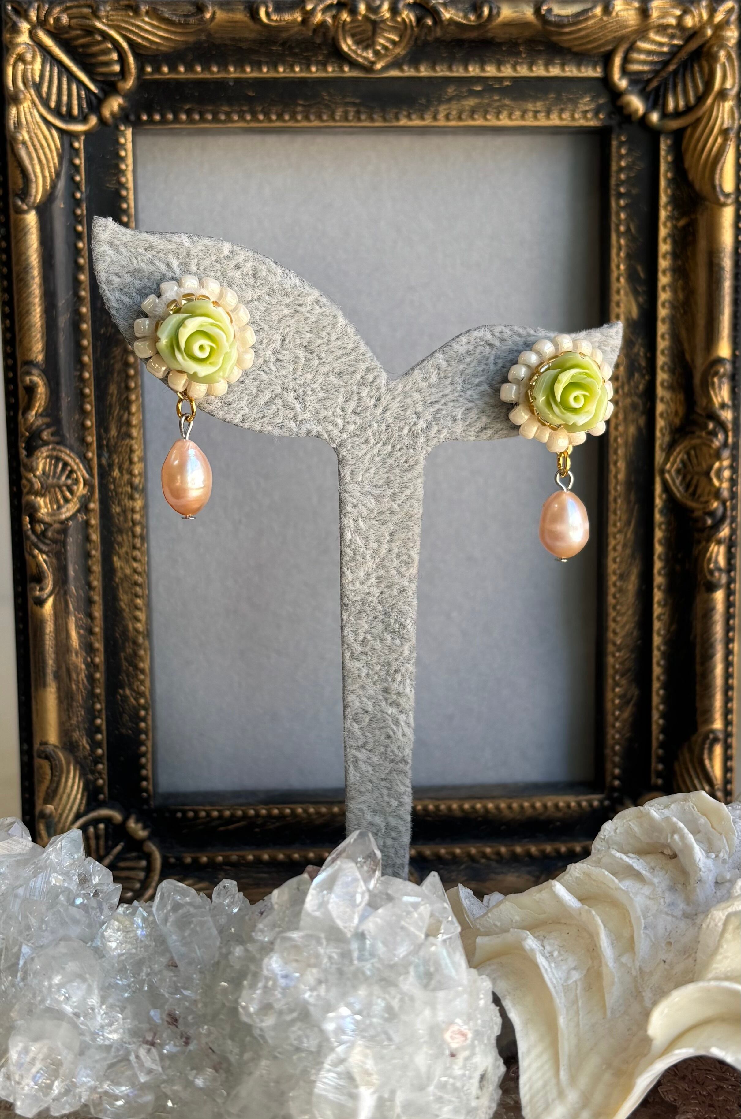 薄黄緑のローズをビーズで囲み、その下には上品なパールが揺れています。
