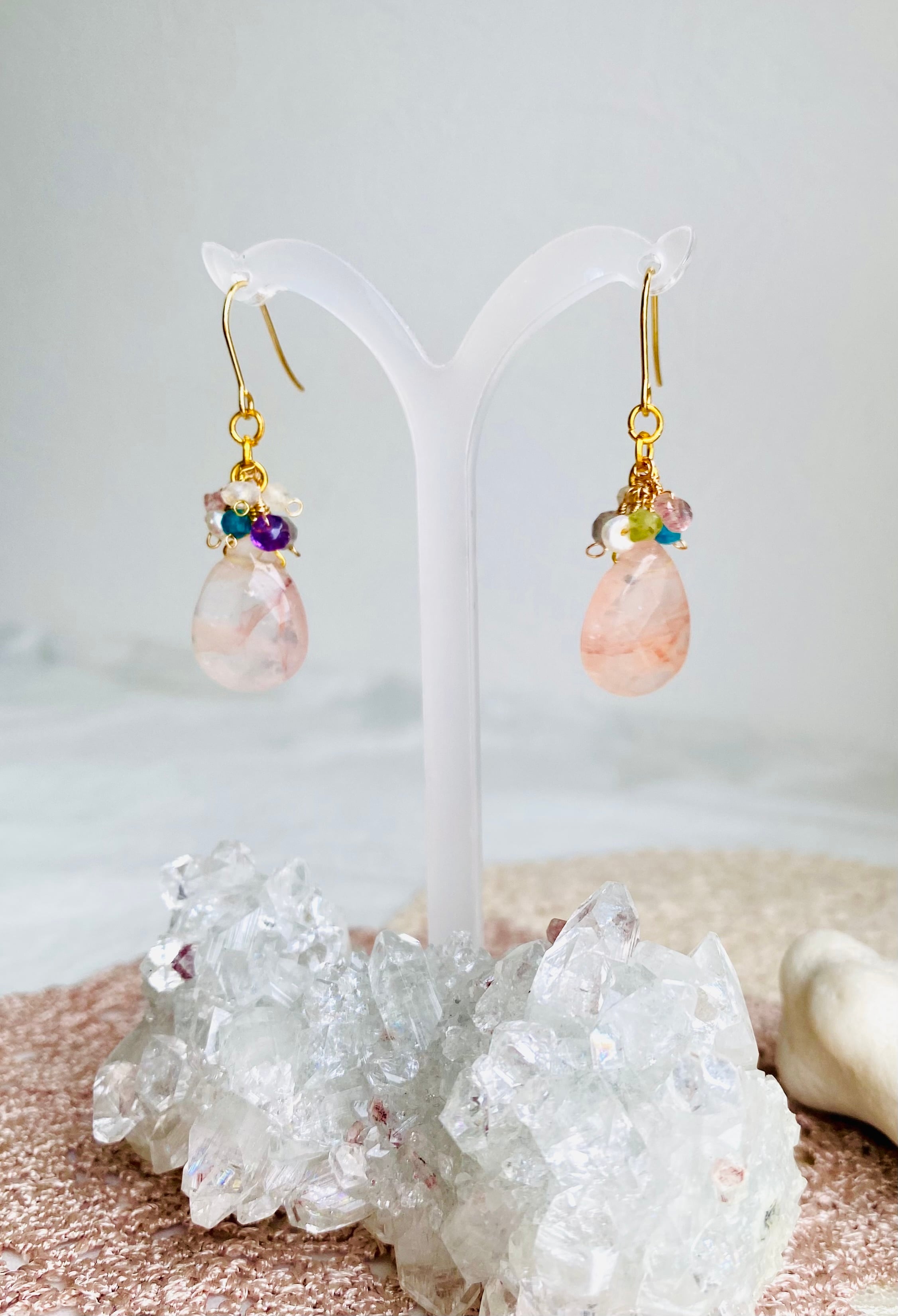 水晶に赤い鉄分が混じってオレンジがかった色になるヘマタイトインクォーツのしずくが、小粒の天然石と共に揺れるイヤリング・ピアスです。