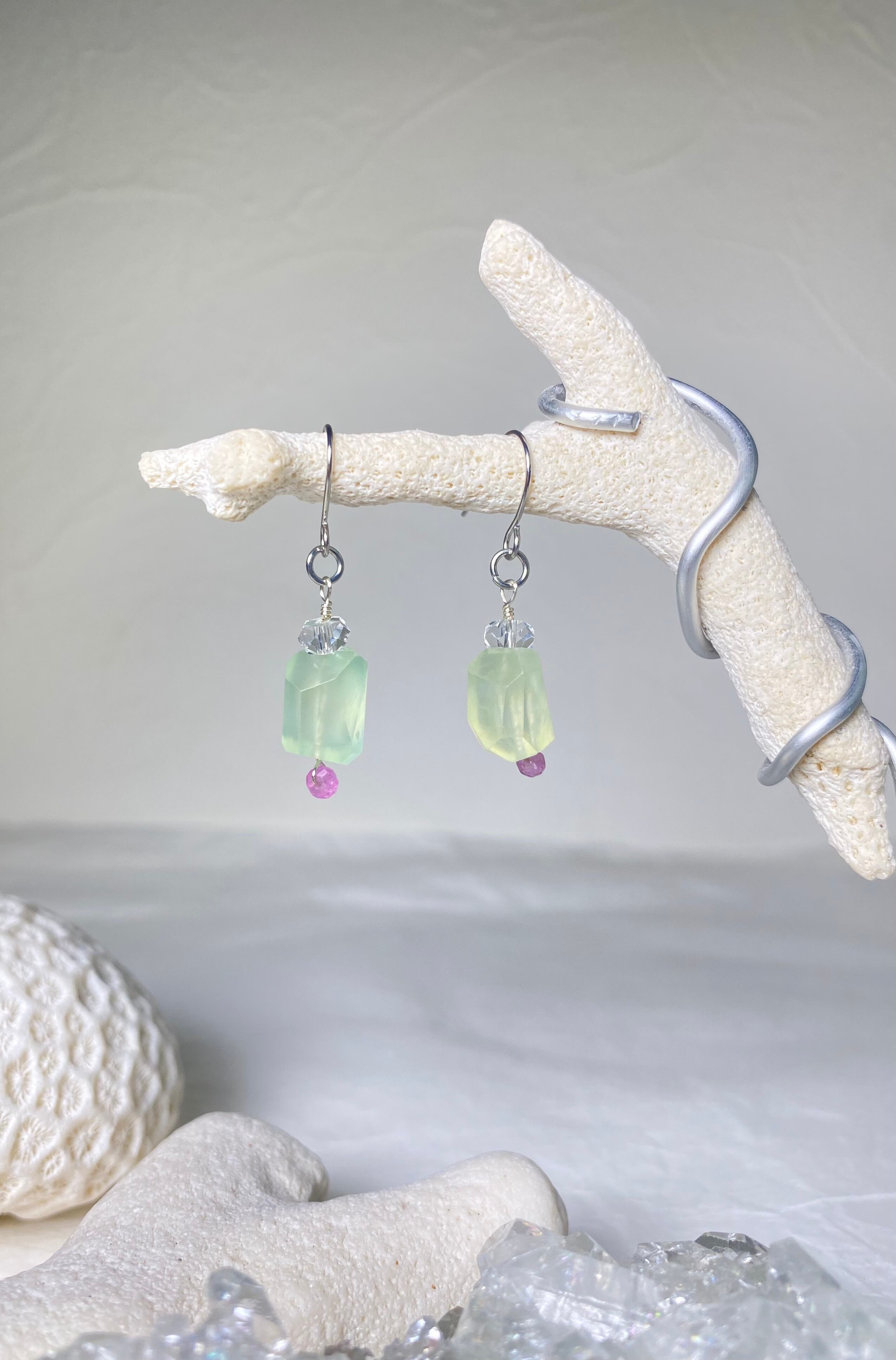 シャーベットカラーのプレナイトとピンクサファイアの揺れるイヤリング・ピアスです。