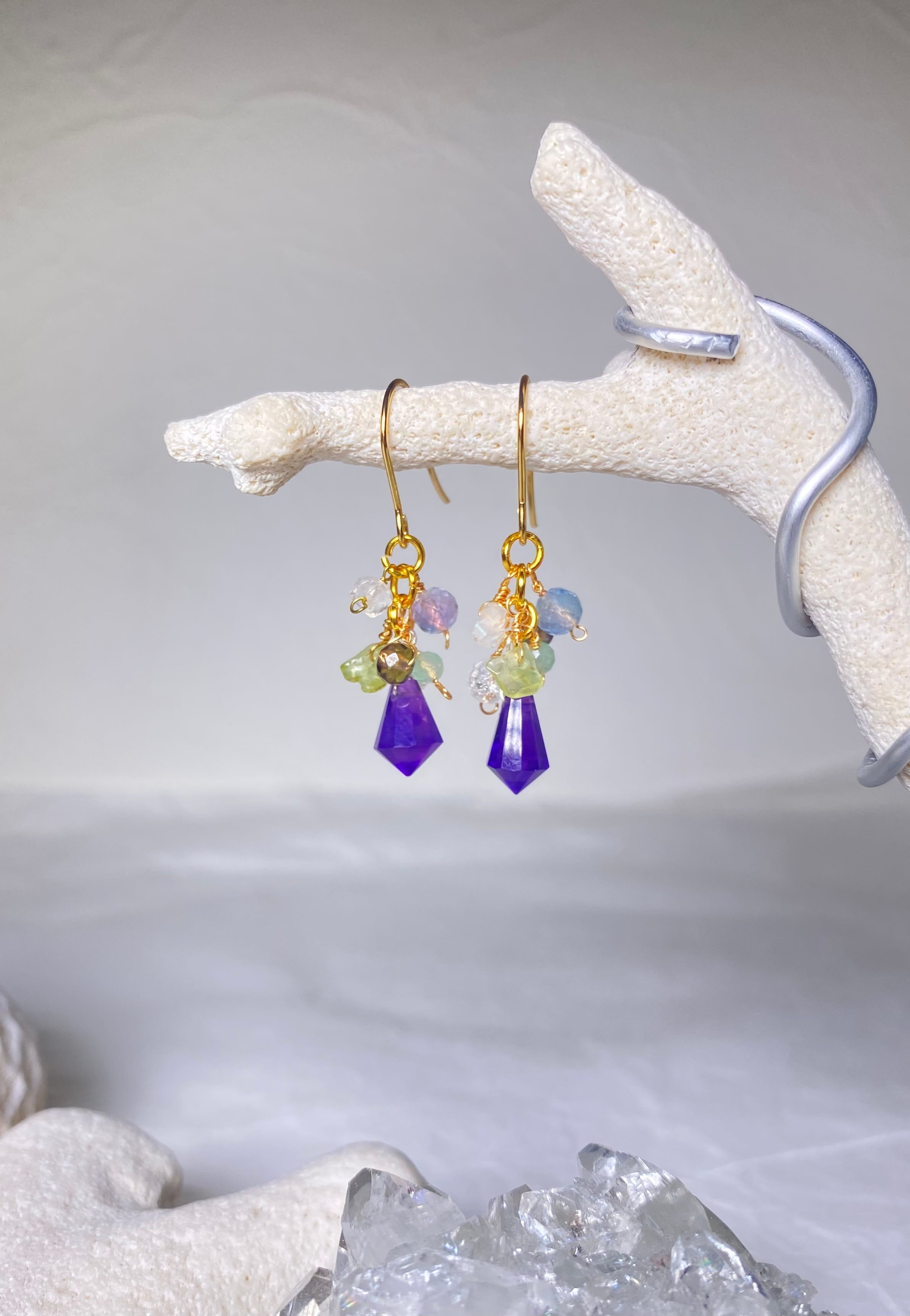 フローライト、ペリドット、ムーンストーン、水晶、スモーキークォーツ、カラージェイド達が輝きと軽やかさプラス。