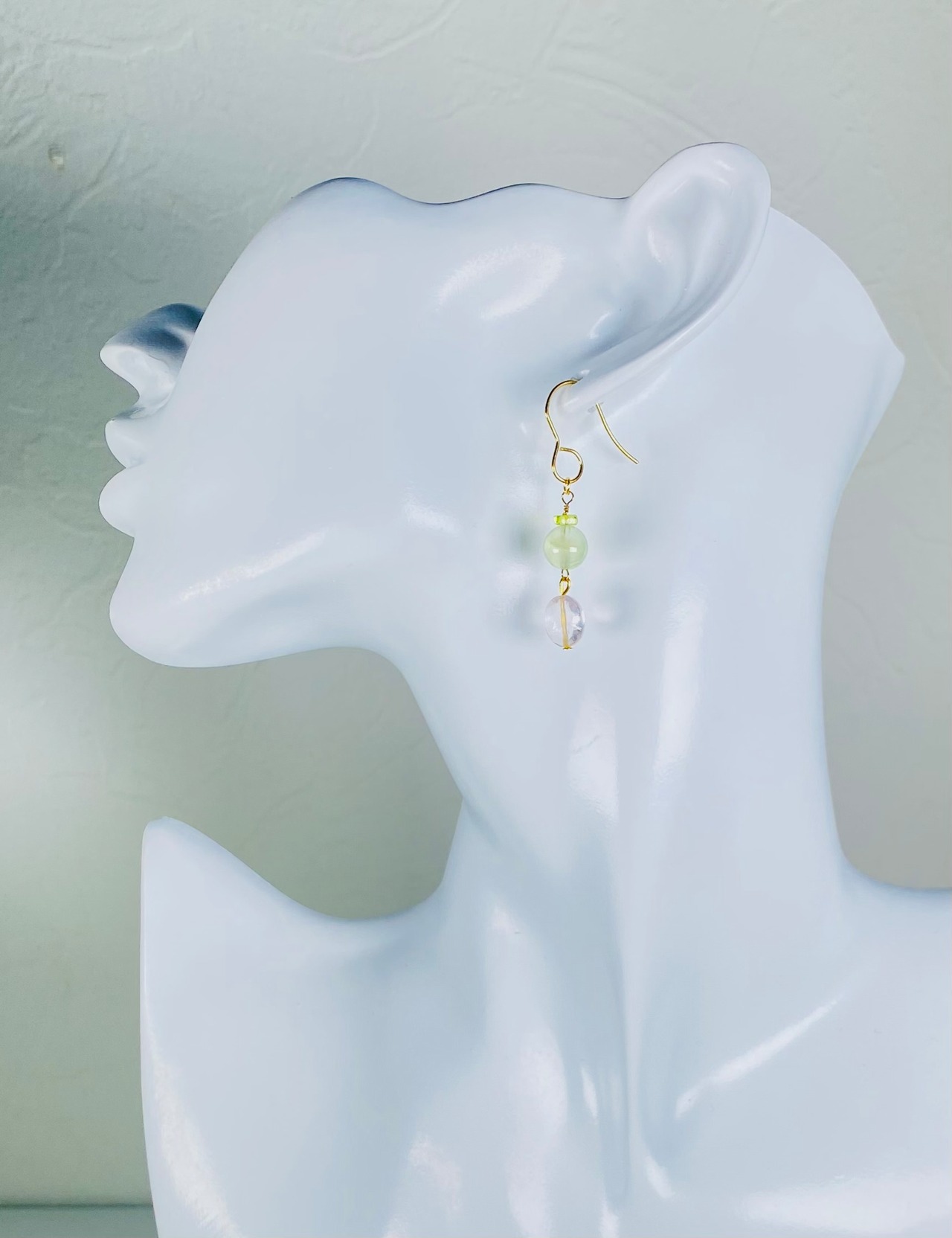 若草のようなプレナイトと、柔らかなローズクォーツを組み合わせた春の訪れを感じるピアス・イヤリング。